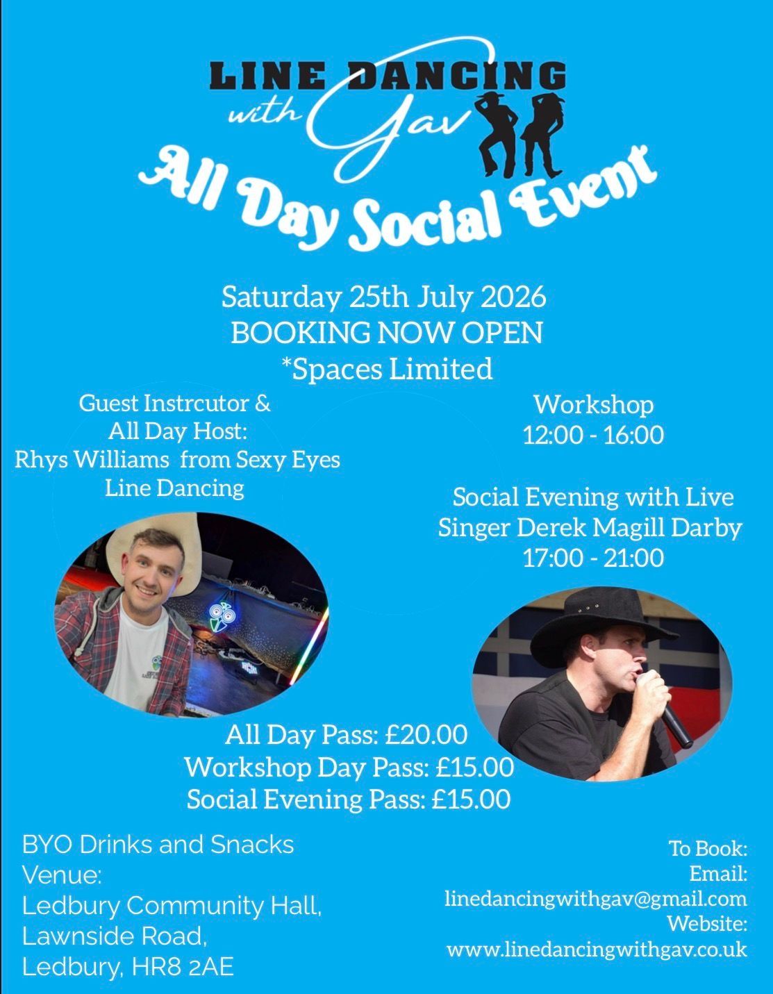 Line Dancing with Gav is hosting a All Day Social Event in 2026. The workshops and event will be hosted by Rhys Williams from Sexy Eyes Line Dancing. In the evening we will have live singer Derek Magill Darby, who will do two sets of 45 minutes, as well as music by Rhys.